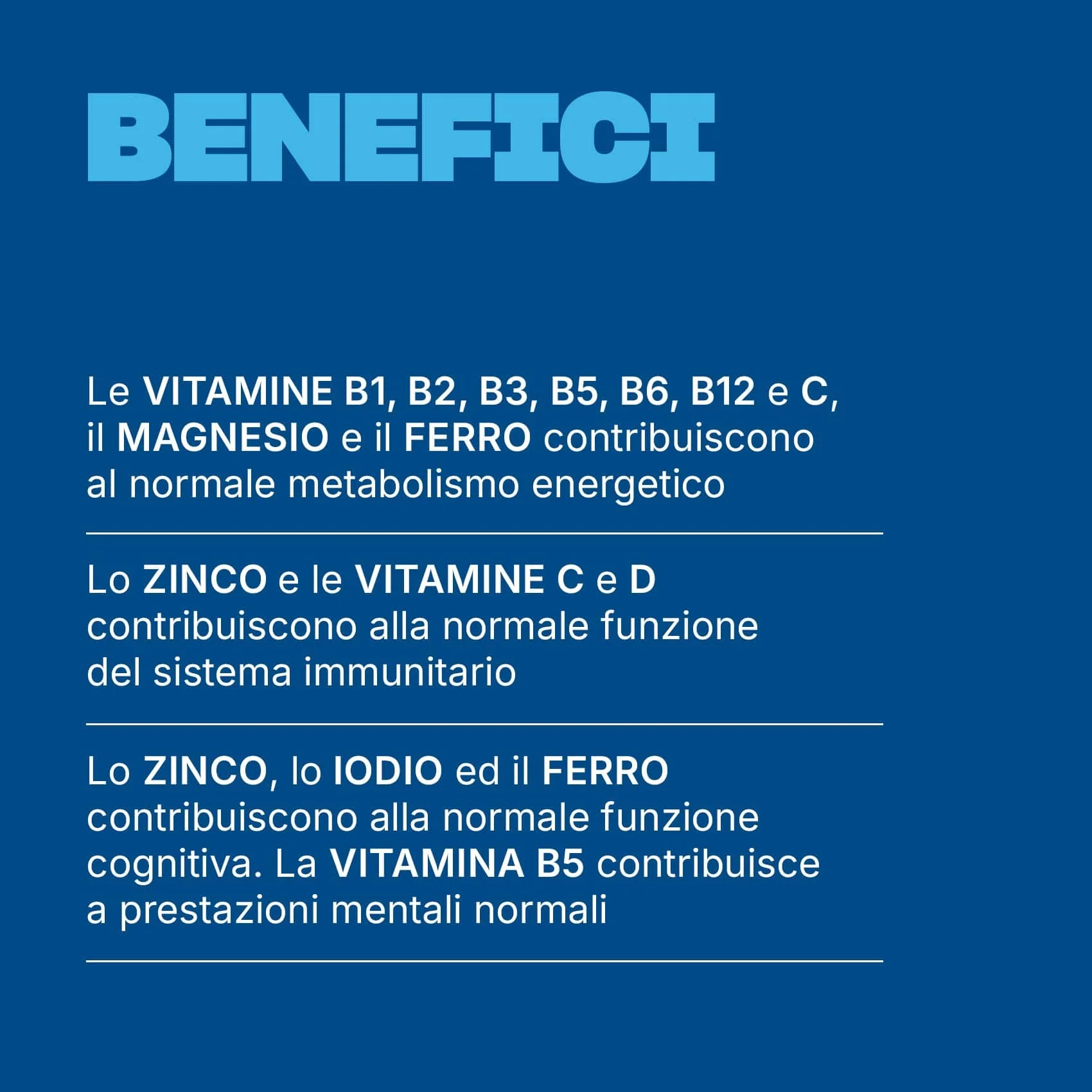 Complesso multivitaminico in formato 30 compresse, senza coloranti artificiali.